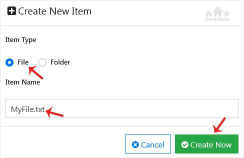 2. Select File as the item type, enter your filename like MyFile.txt, and then click Create Now.
